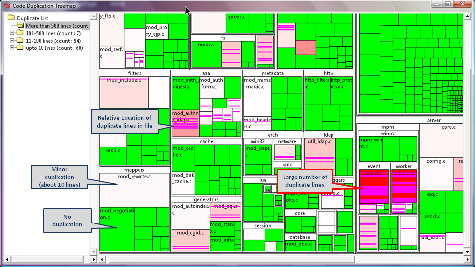 You can visualization the proliferation of duplication in various file as 'Treemap visualization'. Check the screen snap shot of how the visualization looks like. (Thumbnail below)