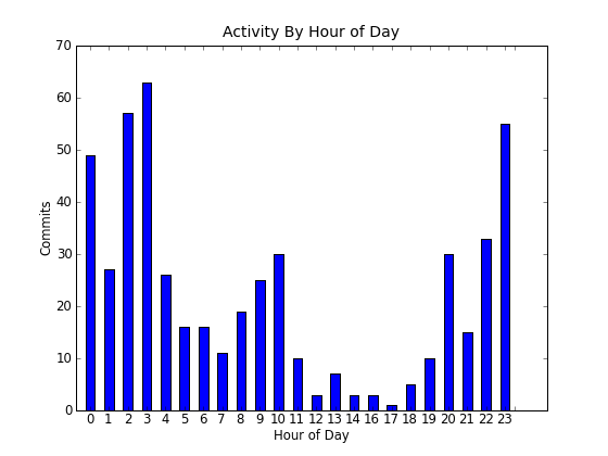 5-6pm seems be typical time of commit. The commit times are in GMT. And I am not sure abou the geographical location of the team members. So no conclusion here. However, if this is a project in a software company with all developers in same timezone and there are regular commits at 10pm, I will conclude that developers are overworking and probably the project is trouble. |