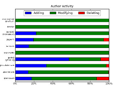 Authors activity in terms of 'addition', 'modifications' and 'deletions' of files. Its an indirect indication of author's role as 'contributor' of new features/code and maintainer of existing code. |